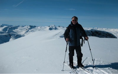 In the summer of 2008 my wife, Sue, and I did a very pleasant hut tour through the Jotunheim. This was a new area to me and I was very taken with the idea of repeating some of it as a ski tour. When I found that the Telemark Ski Co. were in fact running a trip in March 2009 not only visiting some of the huts I had walked to but also skiing some mountains including Glittertind, it was irresistible. To halve the possibility of my skis going astray during the two flights from Manchester I flew with Ryanair from Stansted. The £5 each way ticket finally cost over £100 with rucksack and ski carriage but it was still cheaper than from Heathrow or Gatwick and the bus transfer from Torp was very easy. I spent the night at the Hotel Spectrum close to the bus station and we caught the 9.30 bus to Tyen, changing at Fagernes. The Weasel picked us for an exciting half hour across the snowfields to Fondsbu. A quick ski and an excellent meal got us ready for our tour. It was snowing hard when we set off the following morning for Olavsbu. The weather cleared by mid-morning and we skinned up an un-named 1542m peak on the way. Un-staffed Olavsbu was delightful in the summer and a haven on a wild snowy night. We entered through a sort of tunnel in the snow. There were only nine people there in total and it was really cosy even if a trip to the loo required totally kitting up. We set off for Spitterstulen the following morning in a blizzard. We could hardly see from marker wand to wand. A long climb up was followed by a good ski down to a string of lakes. A climb and a nice ski down took us past the Leirvassbu hut (another of my summer huts) into the valley leading to Spitterstulen. We had to pole the whole way but I did see the big face of Kirkje that I’d climbed the previous year. Spitterstulen is used for winter courses for schools so it was a bit of shock to see dozens of children after the peace of Olavsbu but they were unbelievably well behaved. The next day a steep skin up, again in wild weather, followed by a long level section took us to the top of the valley down to Glitterheim. A good ski down was followed by another long plod down the valley. The hut was very quiet as it was actually still pre-season. The contrast in weather the following morning was amazing. Clear blue skies and dead calm. Although Glittertind was scheduled as the grand finale it was decided unanimously to go for it. It was skins on from the front door. Ours were the only ski tracks on the mountain after several days of blizzards. The final ridge is steep on all sides and there was masses of snow but the wind had been straight onto the slope so it wasn’t likely to avalanche on our side. The views all round were stunning and we could clearly see Galdepyggen apparently quite close. The first and steepest section had a lot of surprisingly heavy snow on but it got better and better ayou went down and a lot of the descent was fast, exhilarating paralleling on perfect snow. The weather for the next two days was perfect. We skied Nautgardsoksle (2089m) which was a straight skin up and ski down from the hut. The higher snow had icy patches and sastrugi on bits of the ridge but the main ski down was great.